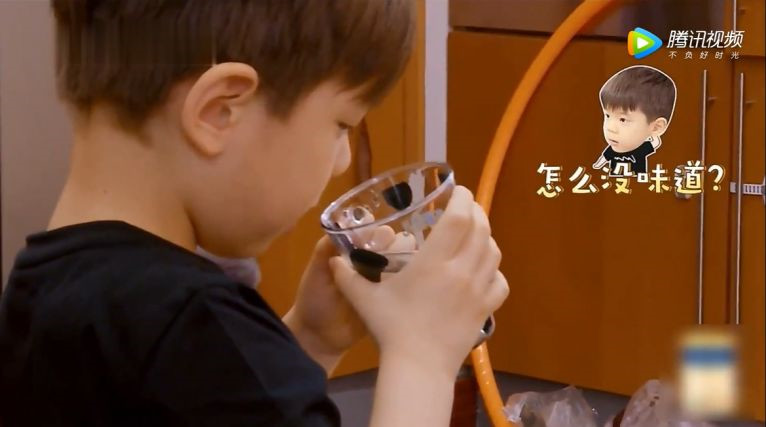 节目《妈妈是超人》中,儿子嗯哼想为霍思燕做一杯果汁。